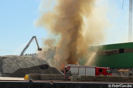 De grote houtstapel van veertig meter op veertig staat volledig in lichterlaaie. De brandweer zal nog geruime tijd nodig hebben om de brand volledig te blussen. Het naastgelegen gebouw liep schade op, maar deze lijkt al bij al mee te vallen. Er vielen geen gewonden.